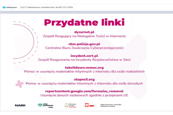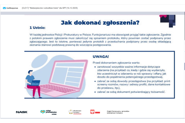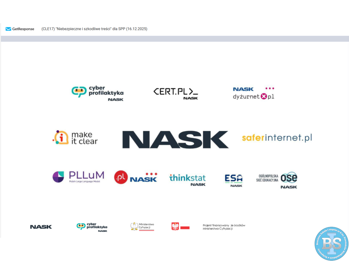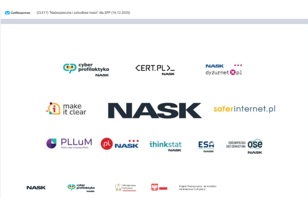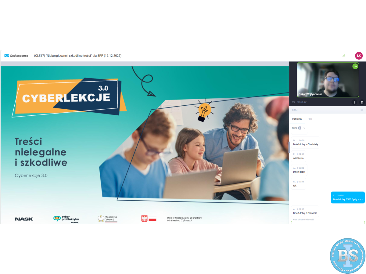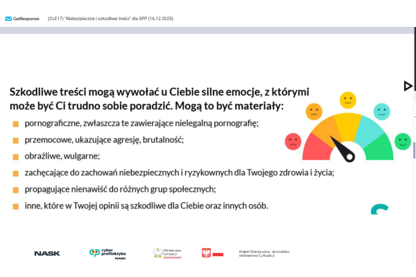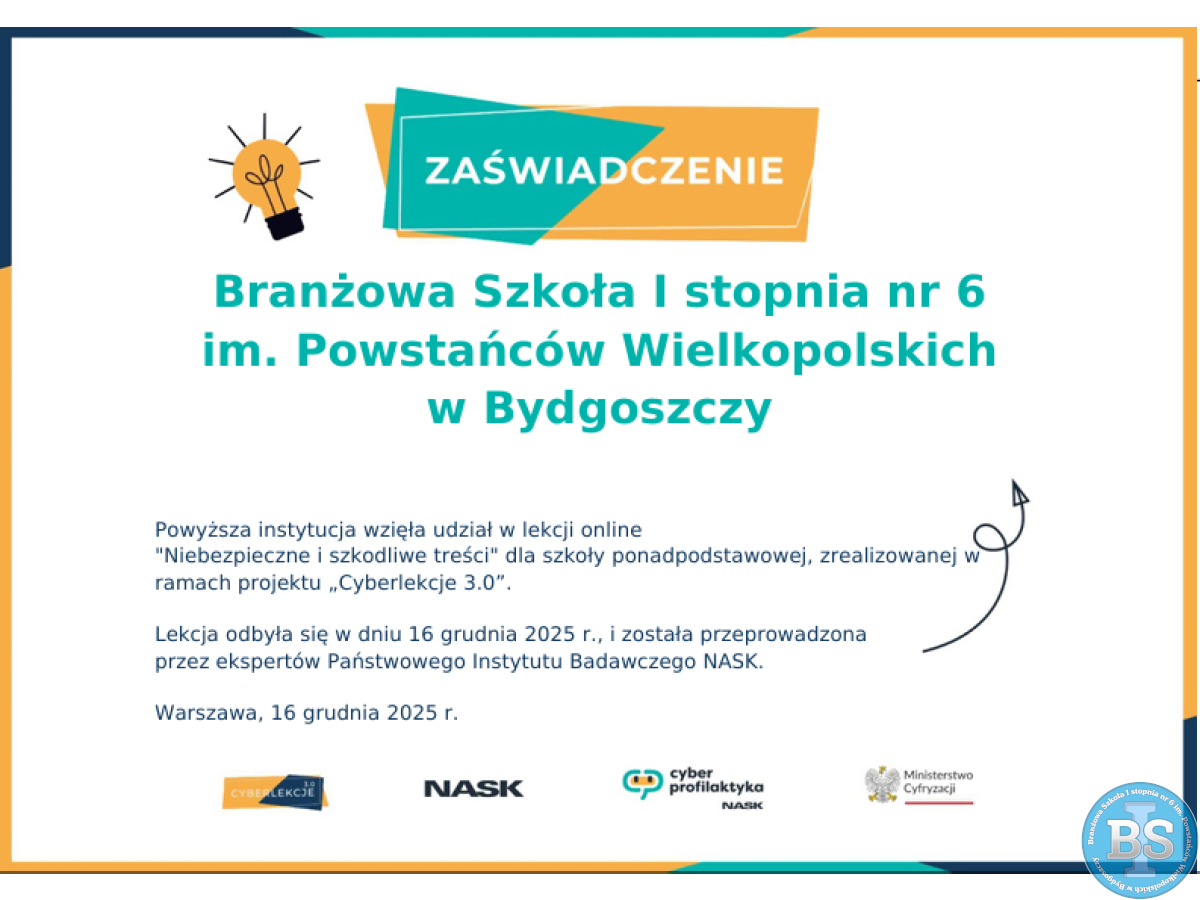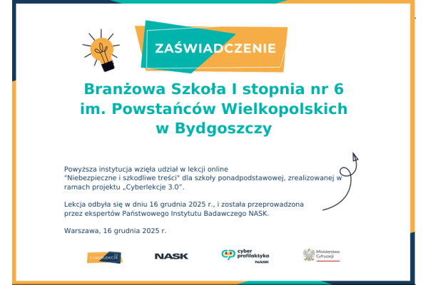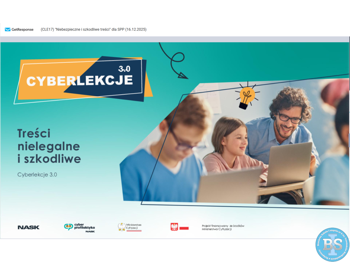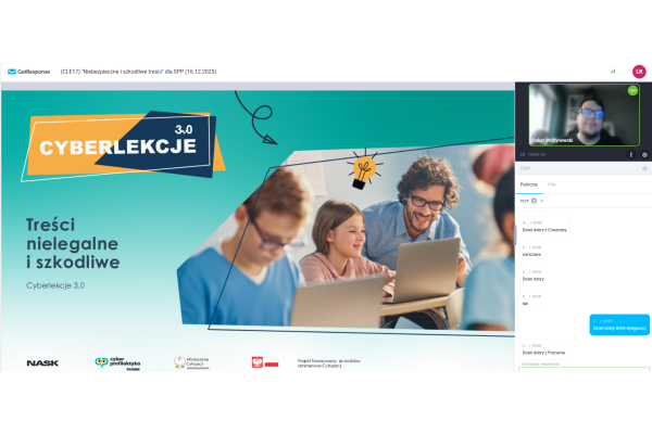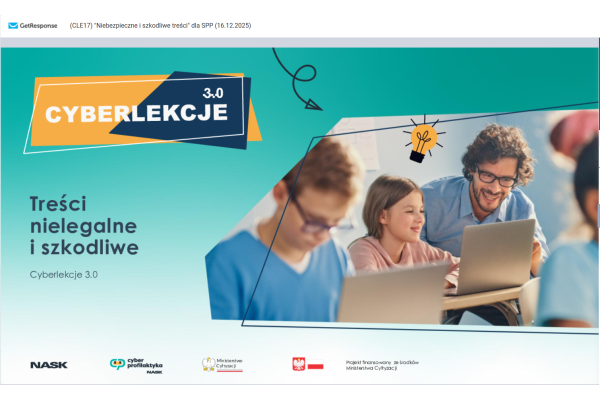 W dniu 16.12.2025r. uczestniczyliśmy w lekcji on-line - Cyberlekcje 3.0. Jest to projekt edukacyjny, który jest realizowany w ramach współpracy Ministerstwa Cyfryzacji oraz Naukowej i Akademickiej Sieci Komputerowej – Państwowego Instytutu Badawczego (NASK-PIB).