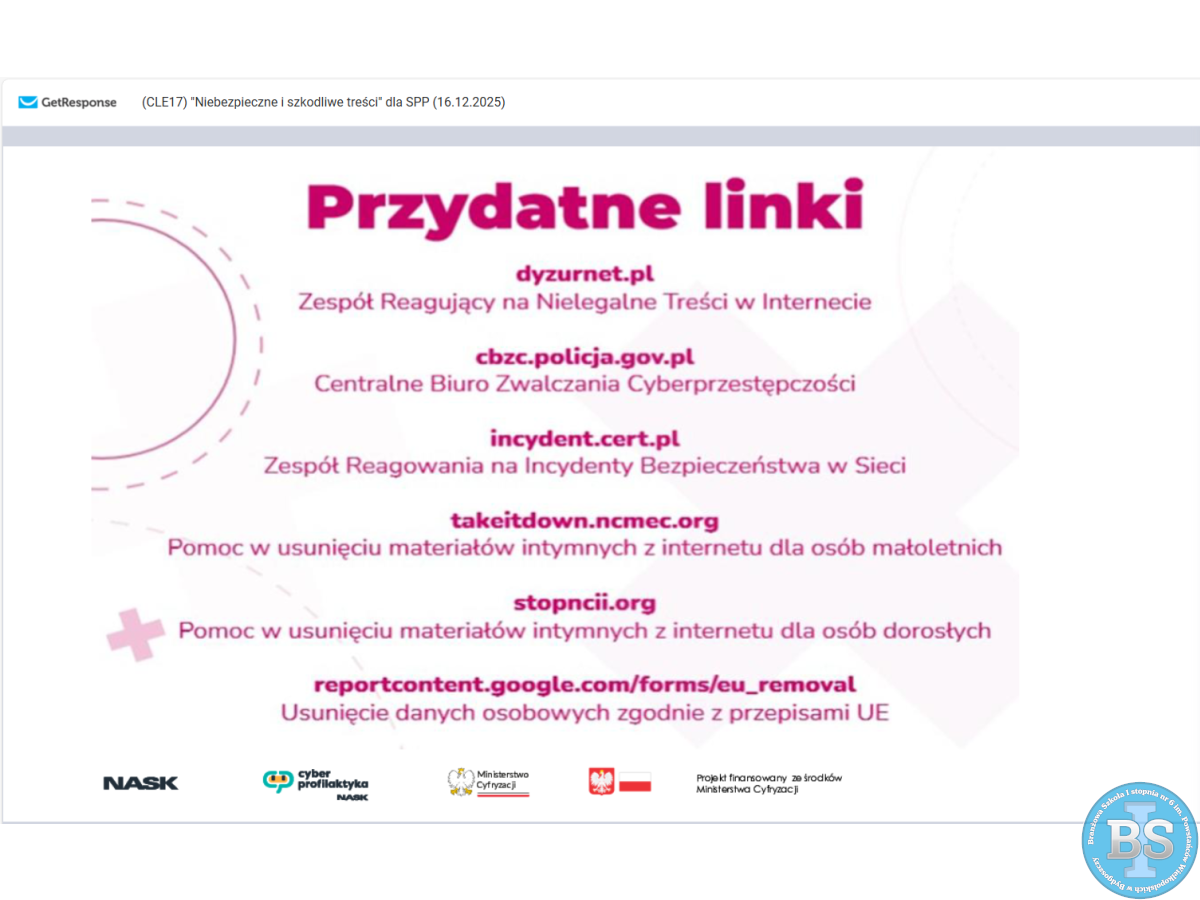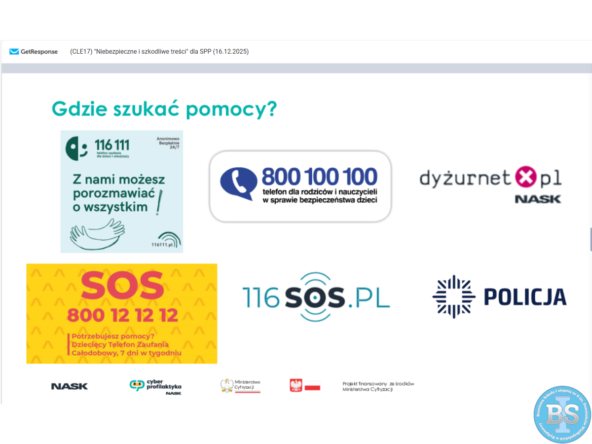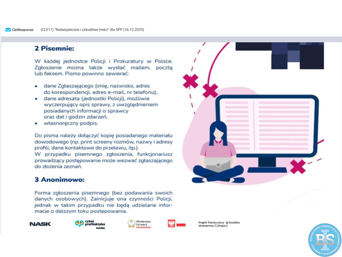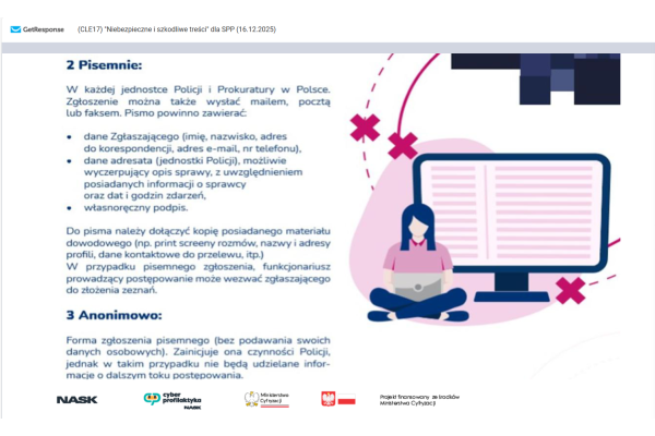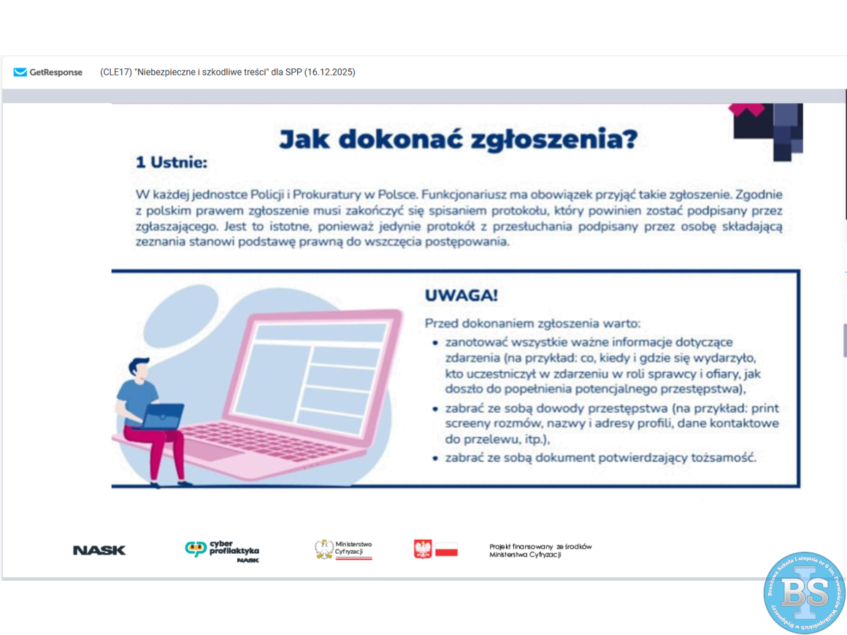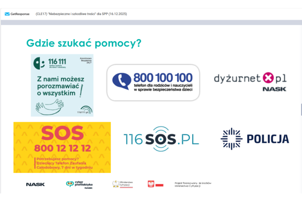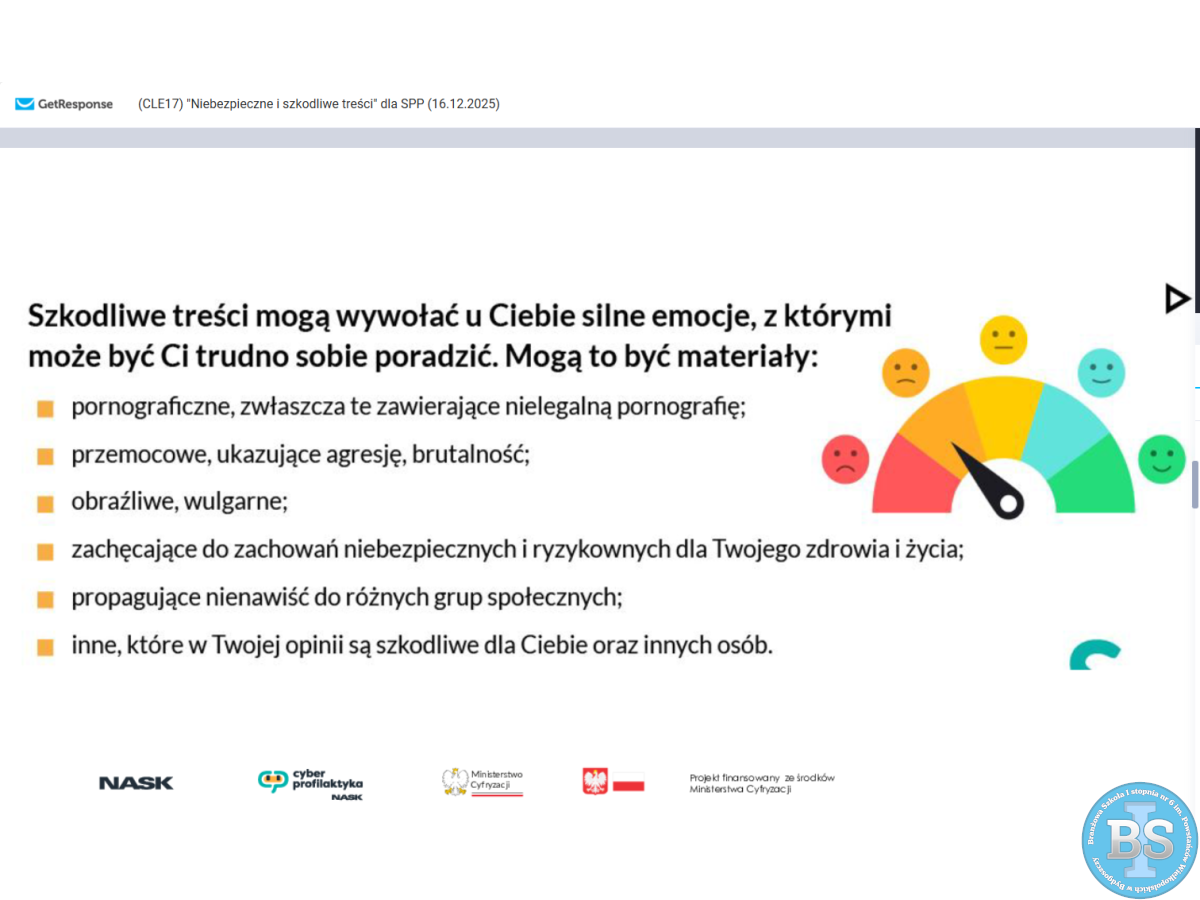 W dniu 16.12.2025r. uczestniczyliśmy w lekcji on-line - Cyberlekcje 3.0. Jest to projekt edukacyjny, który jest realizowany w ramach współpracy Ministerstwa Cyfryzacji oraz Naukowej i Akademickiej Sieci Komputerowej – Państwowego Instytutu Badawczego (NASK-PIB).