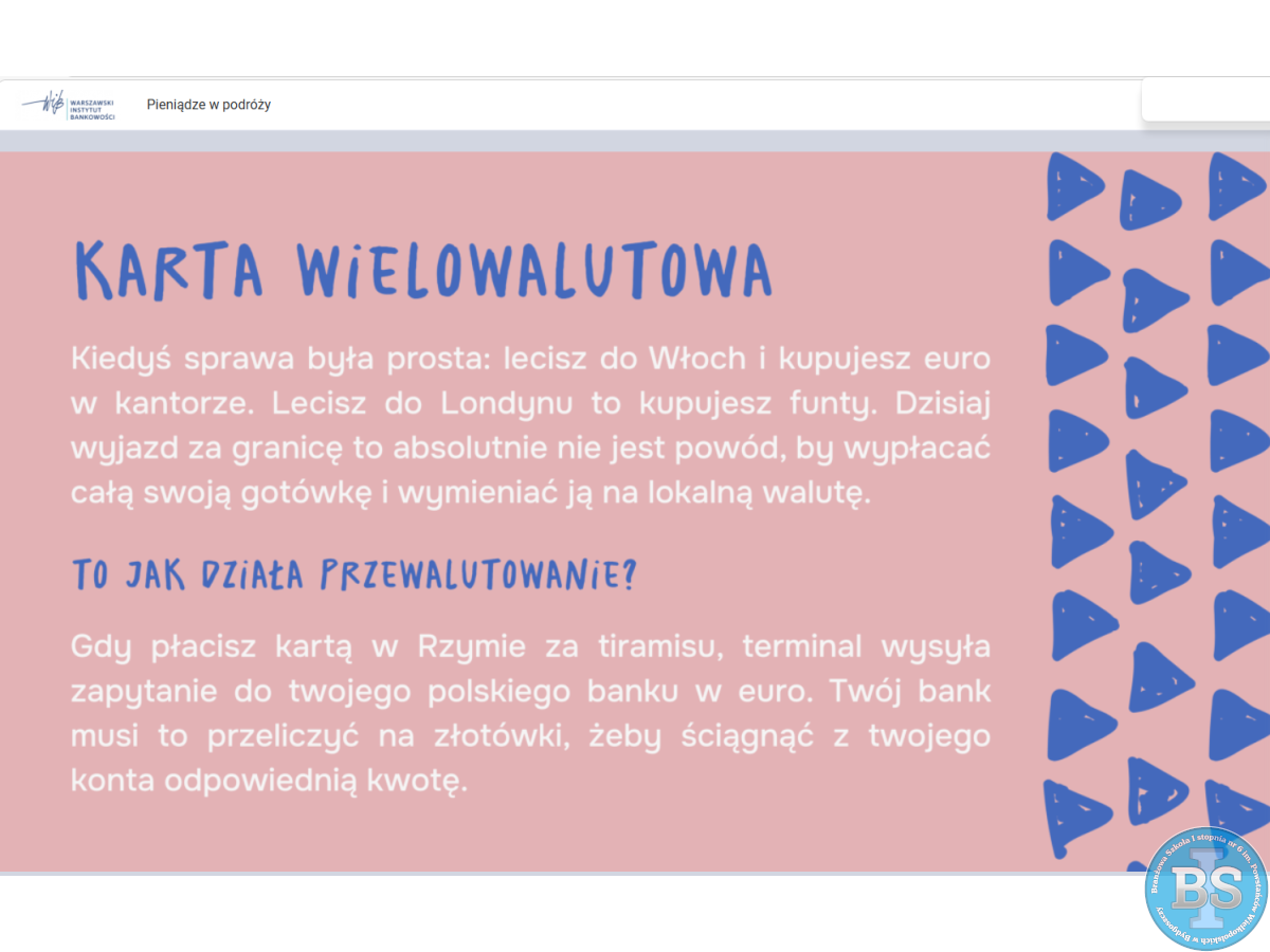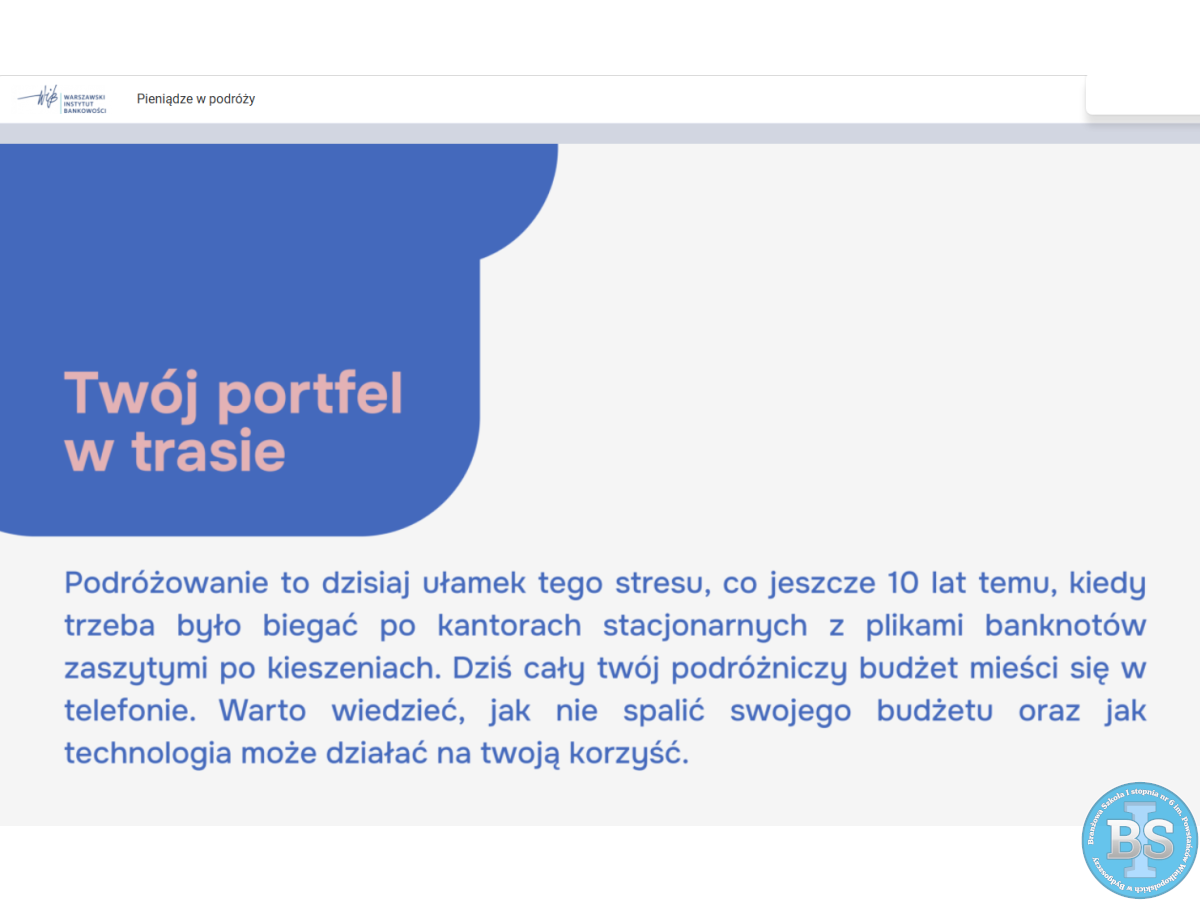 W dniu 19-03-2026r klasa IIIB, IIID uczestniczyła w lekcji online „Pieniądze w podróży” organizowanej przez Warszawski Instytut Bankowości.