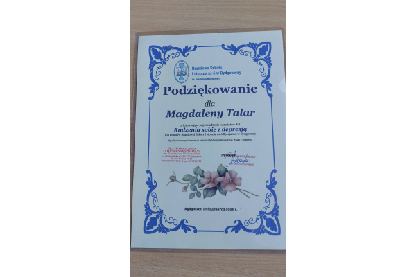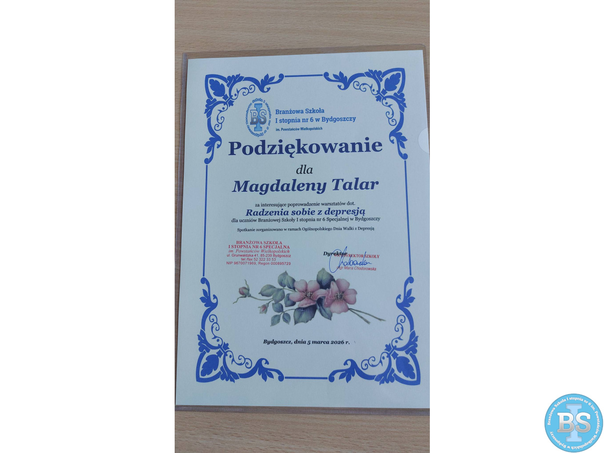 Z okazji Ogólnopolskiego Dnia Walki z Depresją 5.03.2026 odbyło się w naszej szkole spotkanie z socjoterapeutką. Podczas rozmów z młodzieżą pani Magdalena Talar poruszyła wiele istotnych tematów dotyczących zdrowia i dobrego samopoczucia. To ważne, byśmy dbali o siebie i zachowywali się właściwie wobec innych osób.