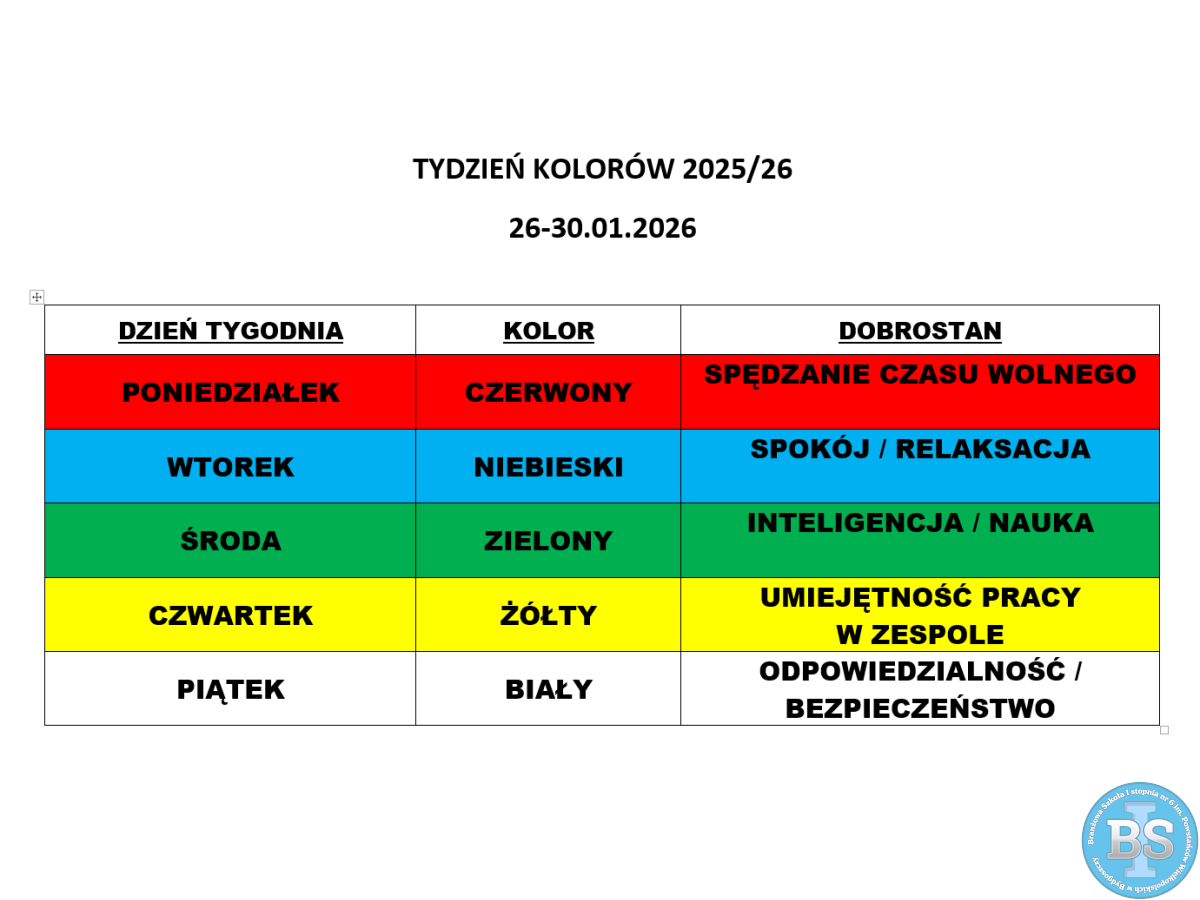 Tydzień Kolorów już od poniedziałku! Mile widziane stroje w kolorach zgodnych z poniższą tabelą .