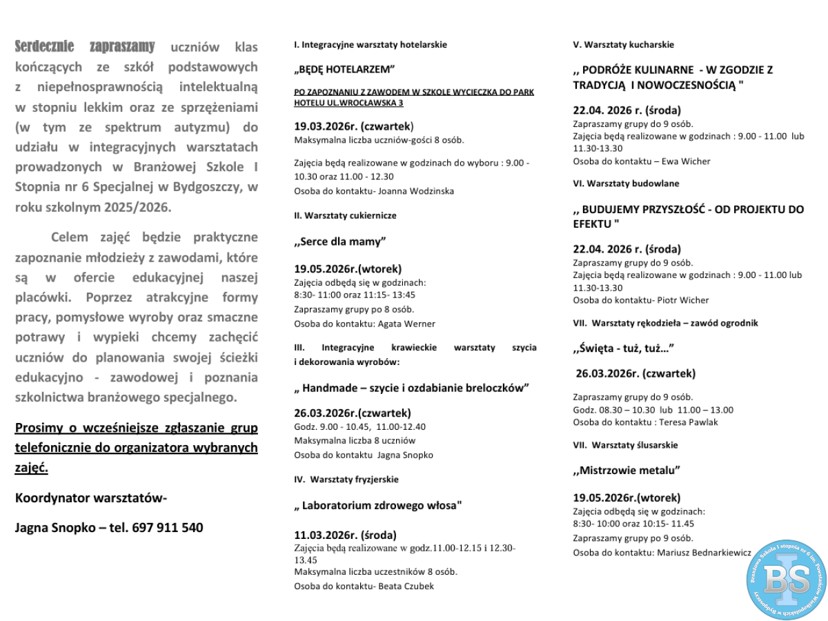 Serdecznie zapraszamy uczniów klas kończących ze szkół podstawowych z niepełnosprawnością intelektualną w stopniu lekkim oraz ze sprzężeniami (w tym ze spektrum autyzmu) do udziału w integracyjnych warsztatach prowadzonych w Branżowej Szkole I Stopnia nr 6 Specjalnej w Bydgoszczy, w roku szkolnym 2025/2026.