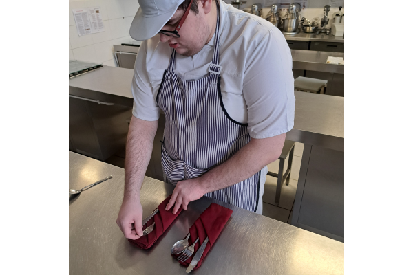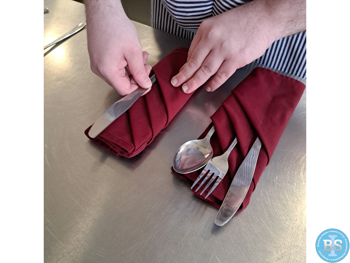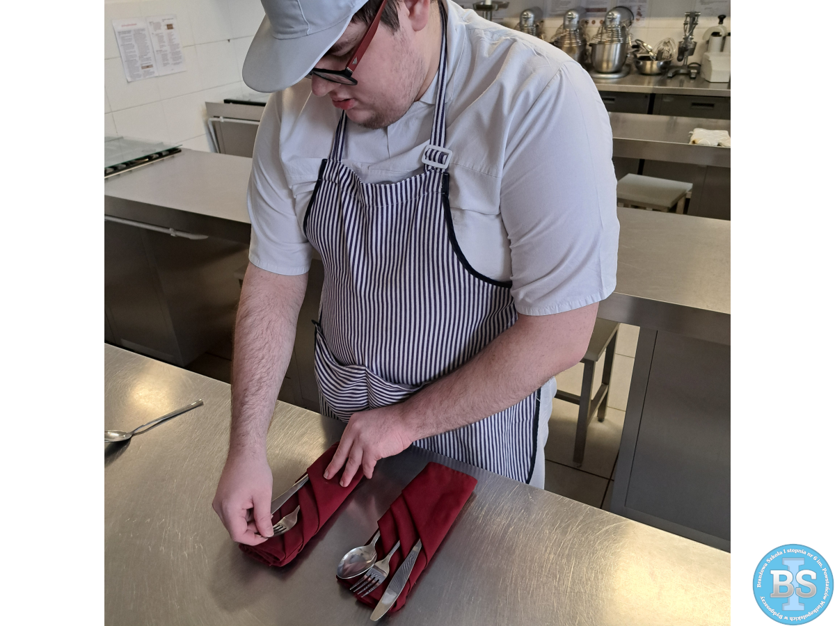 W ramach zajęć praktycznych uczniowie klasy 3e, doskonalili umiejętność nakrywania do stołu, układania talerzy, sztućców, serwetek, podawania kolejności dań oraz właściwego ich spożywania.